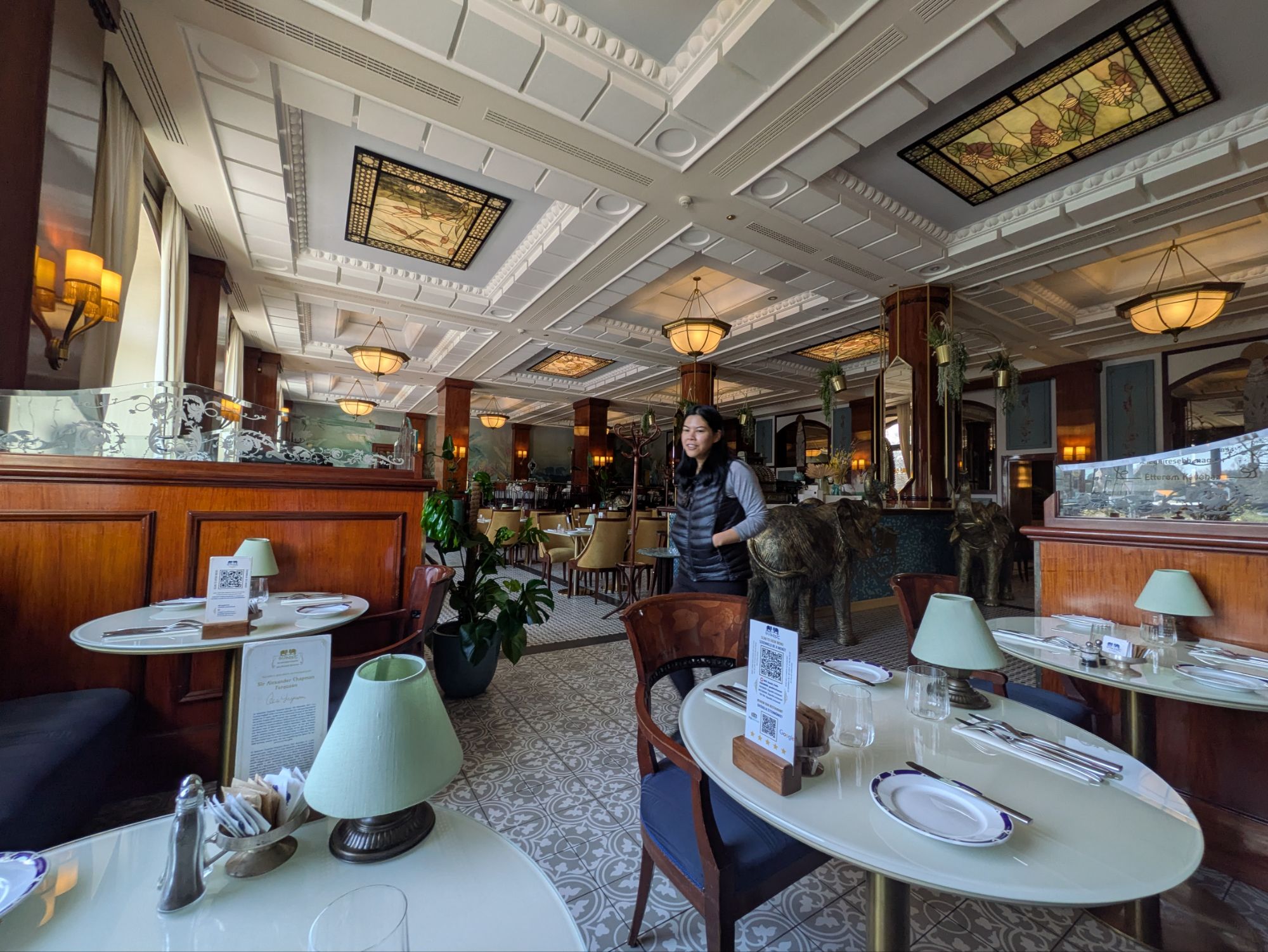 Sunday we checked out of the flat, and got a breakfast of a Kreme, which is like a custard sandwiched between two puff pastries. It was tasty but hard to eat as we couldn’t cut the puff pastry without squishing it. Then we took the cute old subway line, which has only 3 small cars and tiny platforms to the park. We had a nice lunch at an art nouveau / art deco restaurant, Gundel. After lunch we made our way to the Rudas Spa. The Turkish baths part of the spa was my favourite, with old stone and gorgeous lights in the roof. We spent hours switching between the hot baths and saunas before I had to leave for the airport. Steph stayed at the baths for a few hours longer since she was catching a train instead of me needing to get to the airport.