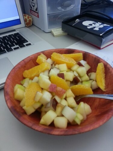 Eating my typical Monday to Thursday breakfast of apples oranges and pears