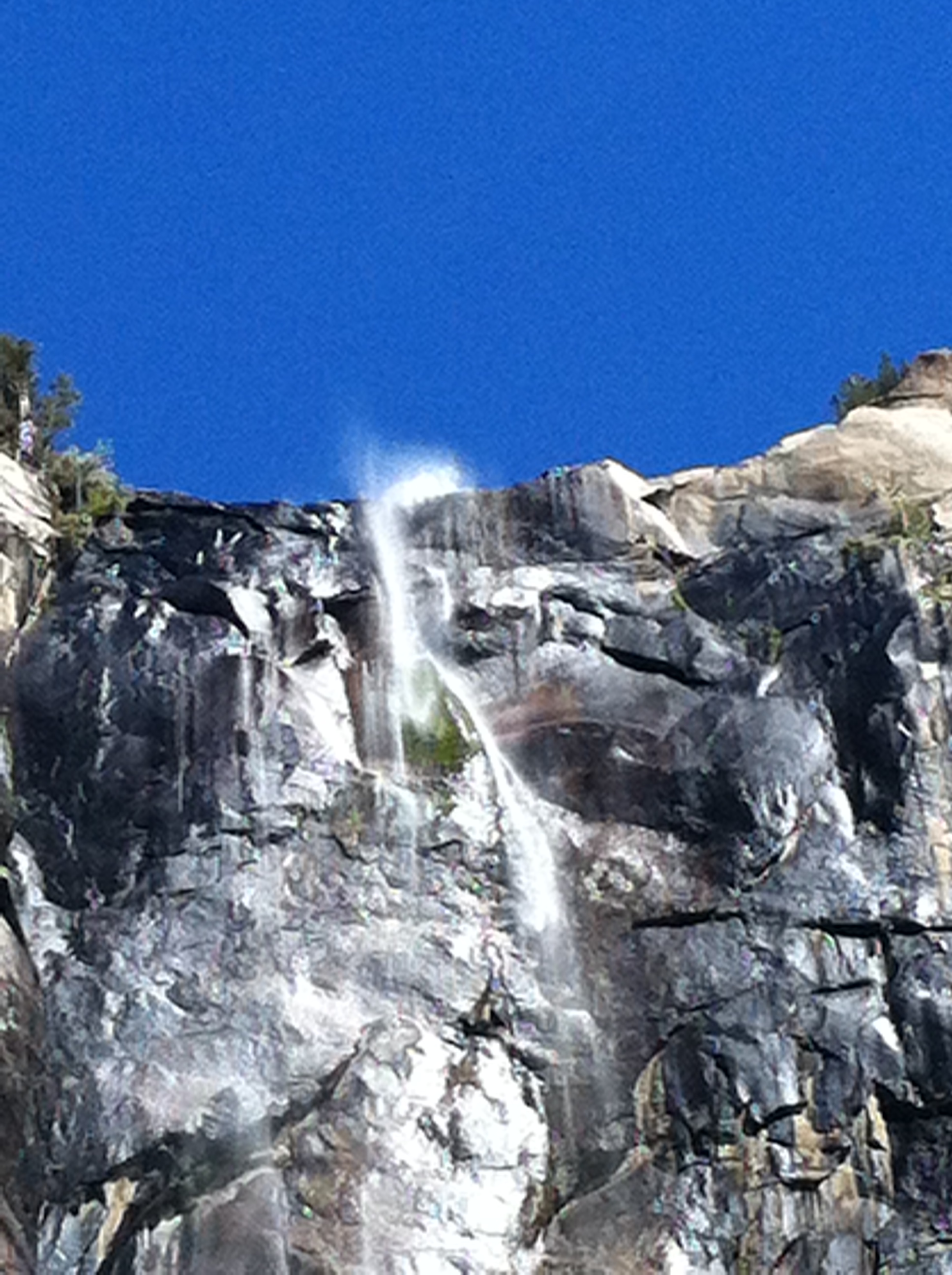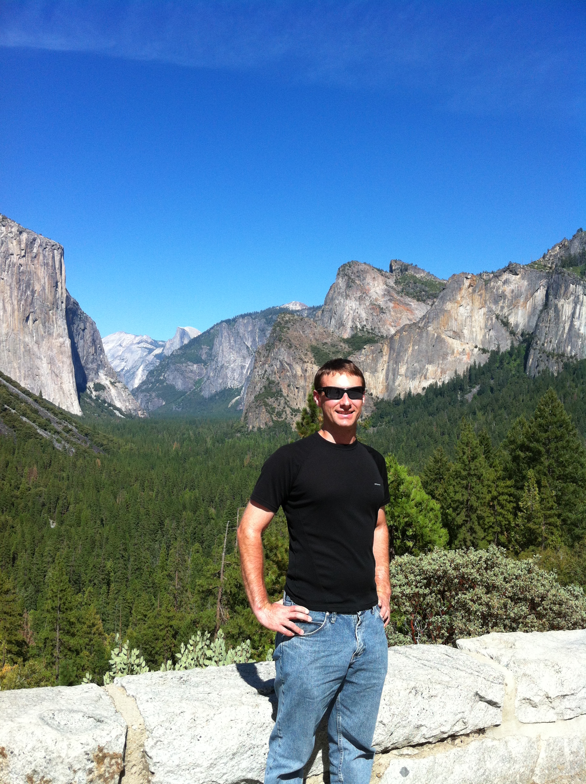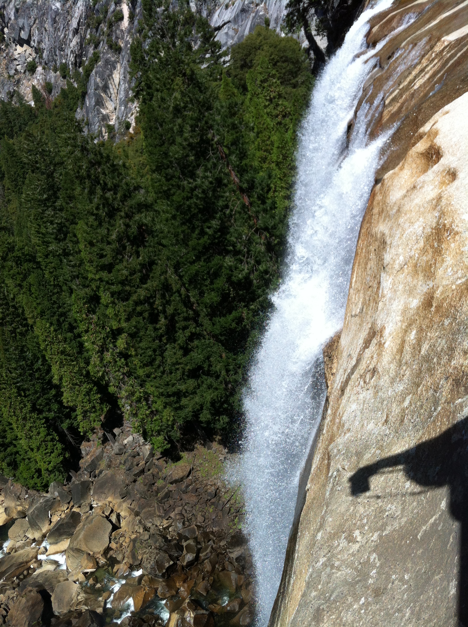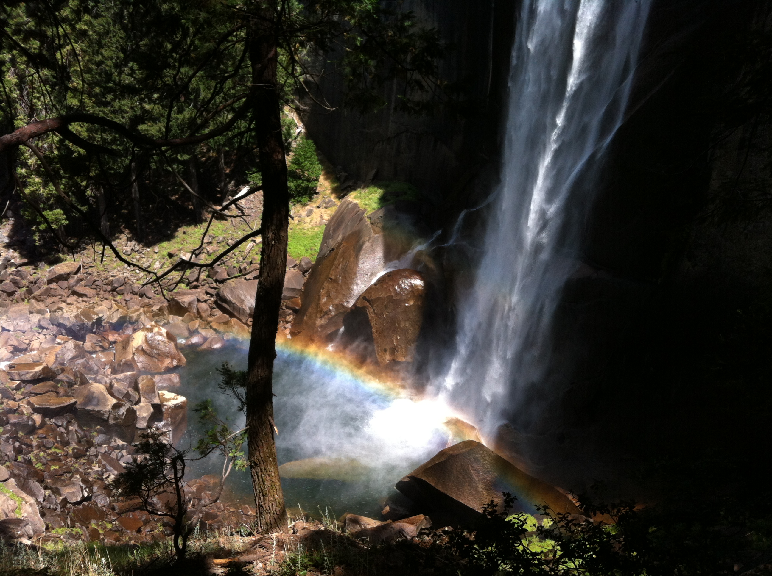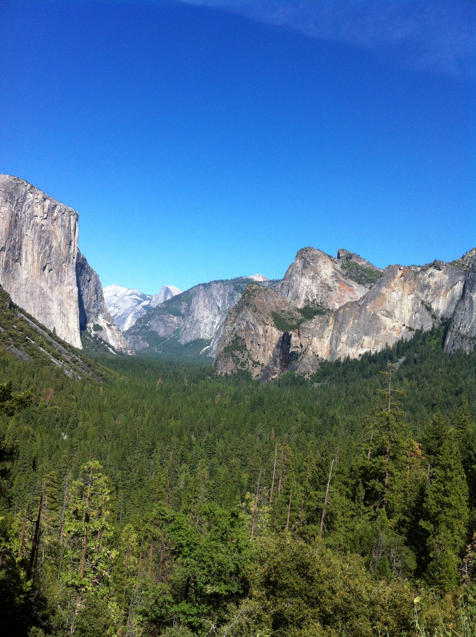 The first thing we did on day two was go to the Vernal Falls trail. This has a footbridge that overlooks the falls as the first main stop, which is where my dad waited for mom and I to come back. Mom and I then went all the way to the top of the falls. The view from the top wasn’t all that good since you couldn’t see the falls at all. The creek at the top is also deceptively calm, and makes you want to go put your feet into the water. The stairs up to the falls were much trickier going down than going up. There was one guy who was running down the stairs, and we saw him later with a ranger who was looking over his ID. We hopped over to the Ahwahnee Hotel for lunch and dad was a little upset that the view he liked the last time he was there was blocked by trees that had grown into the space. The main dining hall had a large window in the back that used to look upon Yosemite Falls, but it was no longer visible. The hall itself was pretty amazing, and had a feeling of rustic luxury. After lunch we went to Yosemite falls, and mom and I put our feet in the water for a bit. The water was cool, but not as cold as we were expecting. We walked back to the bus stop and decided on more hike for the day. We picked out Mirror Lake as the last hike, but when we got there it was all dried up. There were still some pools of water there, but certainly no lake. We then went back to the car and drove back to the hotel in fish camp.