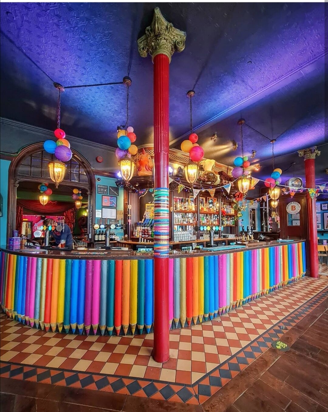 Finally we headed to Ninth Life, which was an amazing bar. They had little scenes that you could peep into through spyholes, including one that was full of rubber duckies. They had lots of cat themed art, and the building facade was painted like a cat had clawed it, but with bright colors. There is a giant cat statue on a sign across the street, and they had pop art takes on the sign.