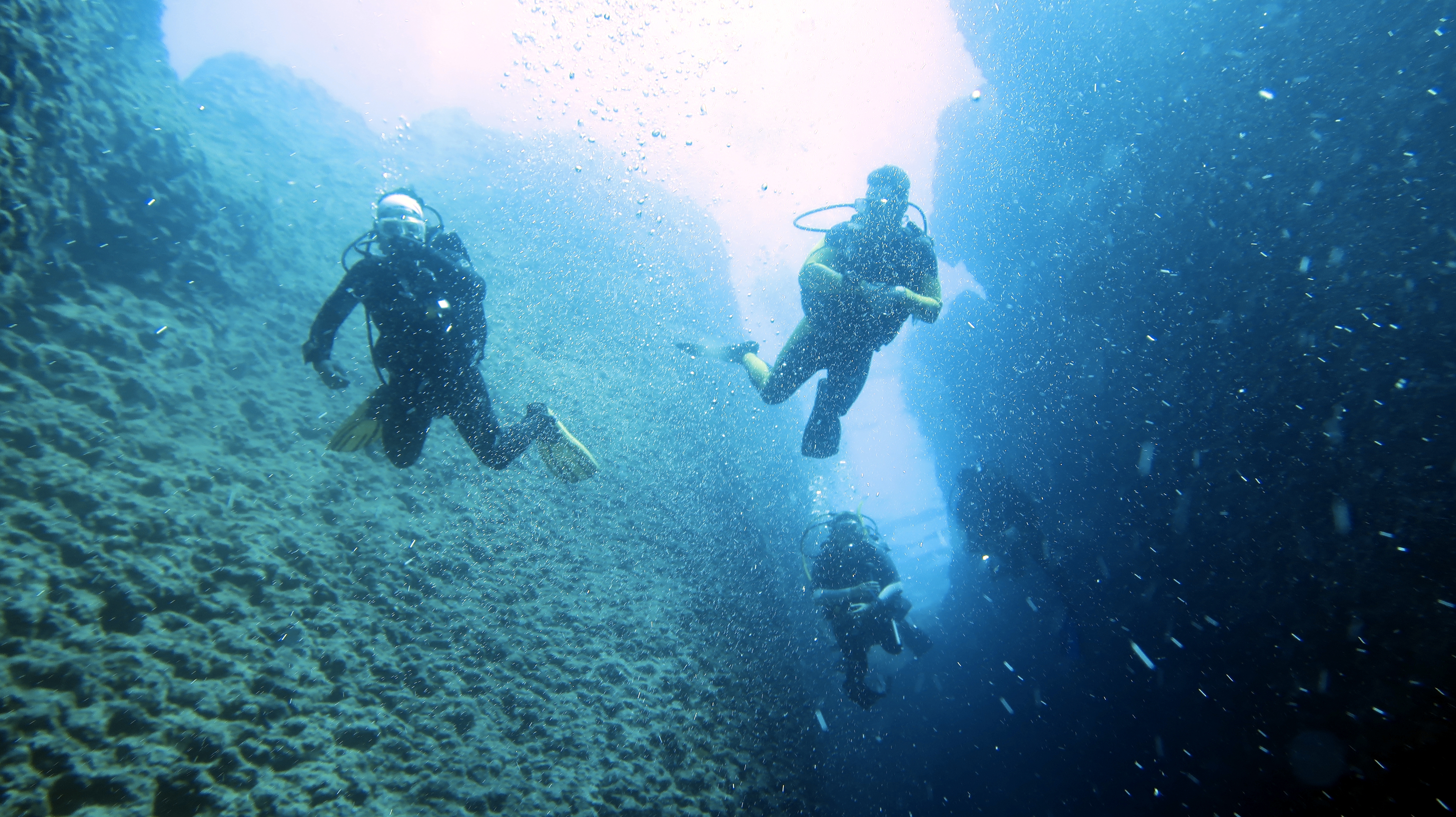 We had a relaxed evening at the hotel, with an amazing sunset. The next day we did an absolutely amazing first dive called Aladdin’s Cavern. It was a huge cavern with a large skylight and archway entrance on the surface. We took the underwater entrance, and it was amazing to come up into the air dome to see the light coming down from above. There was also a large school of fish playing in the light rays that really accentuated the space.