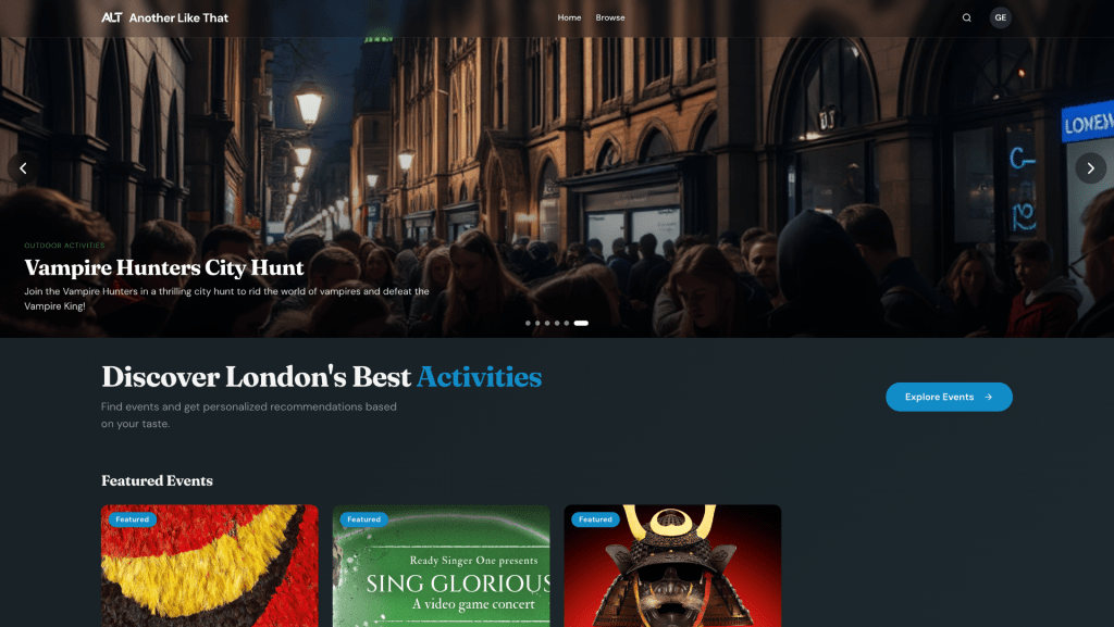 Another Like That is a live recommendation engine designed to help people in London discover events that are similar to what they already love — especially the lesser-known ones. It began with a simple frustration: London has thousands of events happening every week, but discovery is dominated by a handful of promotional platforms pushing the same visible experiences to everyone. I wanted to build something different. Not a promotional feed. Not a static directory. But a living system that understands similarity.